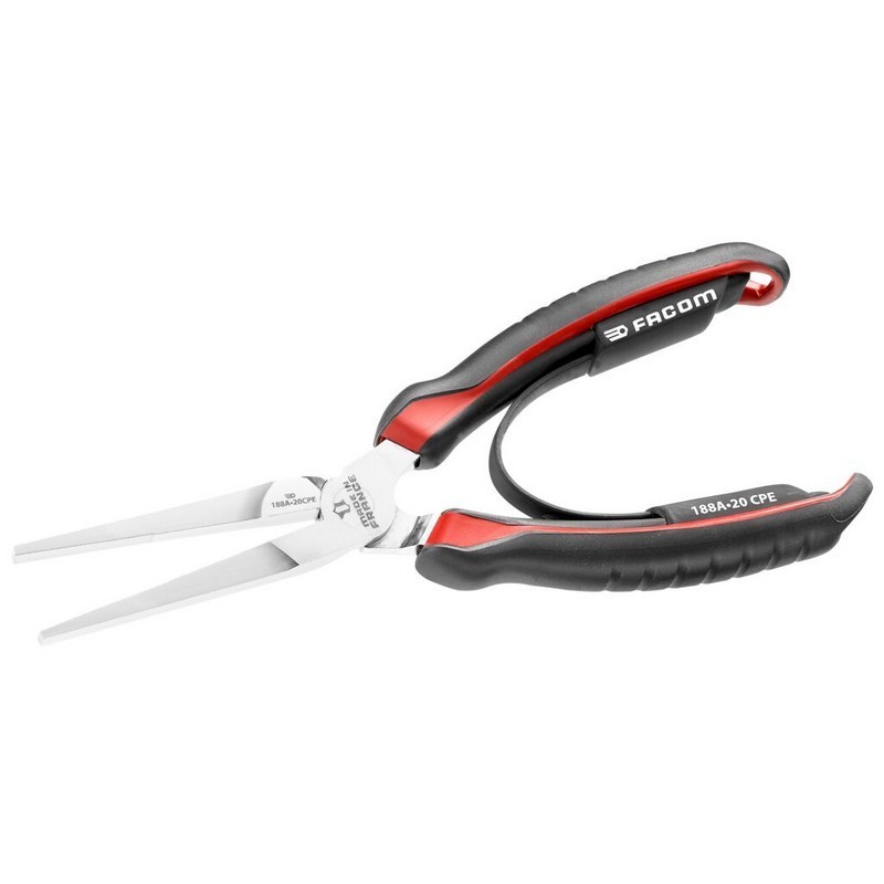 Alicate FACOM de boca o punta plana, cómodamente manejable. Datos técnicos: - Tipo: No aislado. - Longitud total: 168 / 200 mm. - Peso: 140 g.