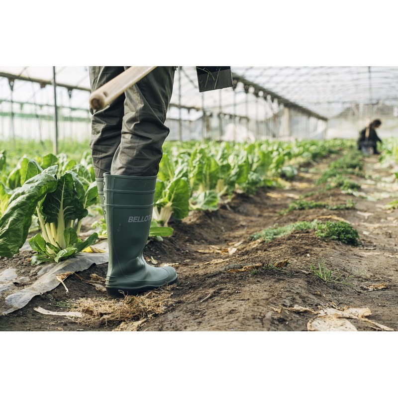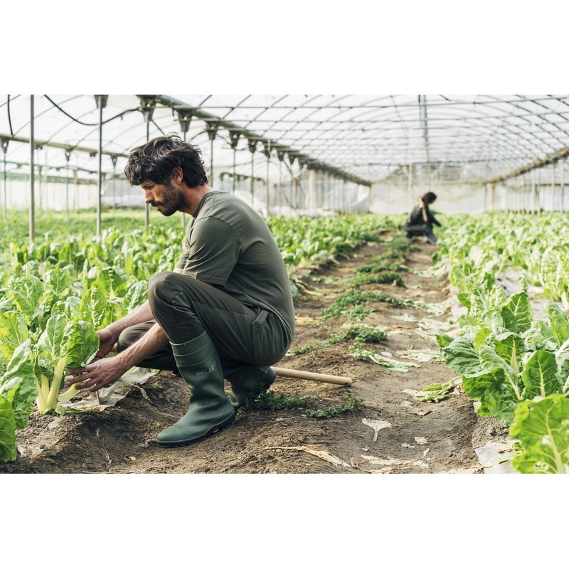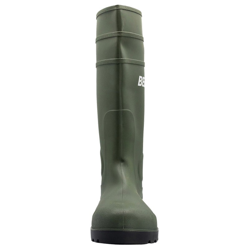 Bota de agua S5 en PVC verde plantilla antiperforación y puntera metálicas, marcas en el talón para facilitar el descalce y forrada en tejido en el interior. Impermeable y cómoda, para la construcción, agricultura e industria.