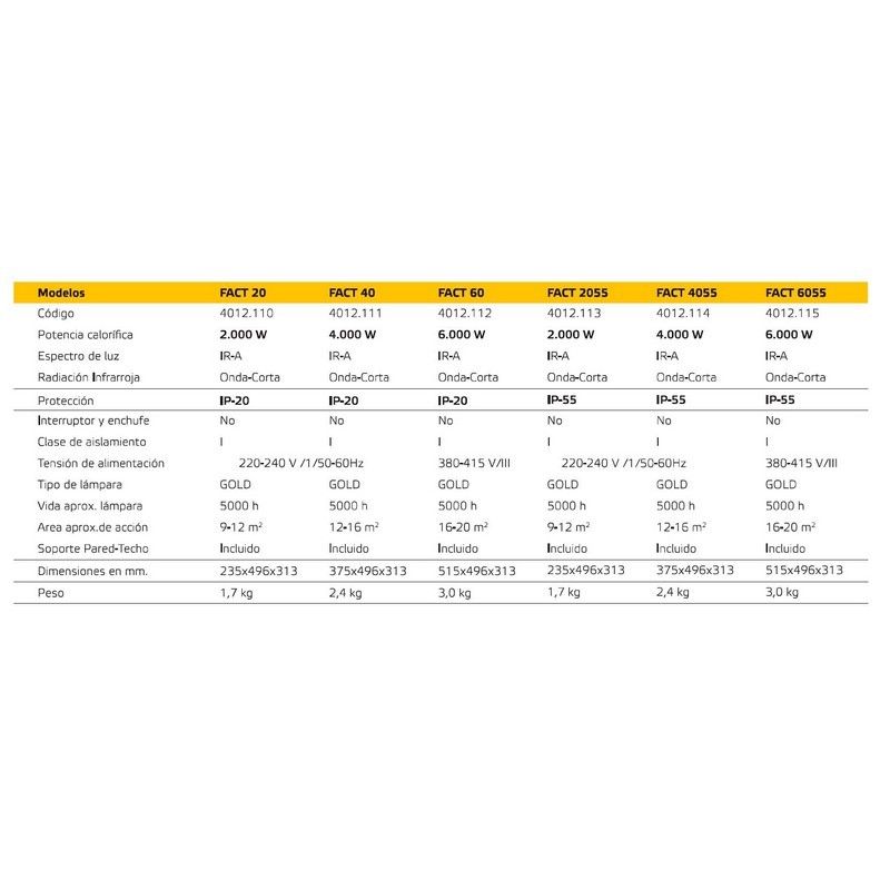 Calefactor eléctrico modular por Radiación Infrarroja de Onda Corta (IR-A), de 2.000 w/h de capacidad calorífica. Tiene un alcance aproximado de 3,5-4 m. y ha sido especialmente diseñado para trabajar en cualquier espacio interior o exterior cubierto. No necesitan ningún cristal de protección como otras marcas, evitando así aproximadamente un 30% de pérdidas de energía. Disponemos de una versión "LG" con protección al agua IP55 y baja luminosidad.