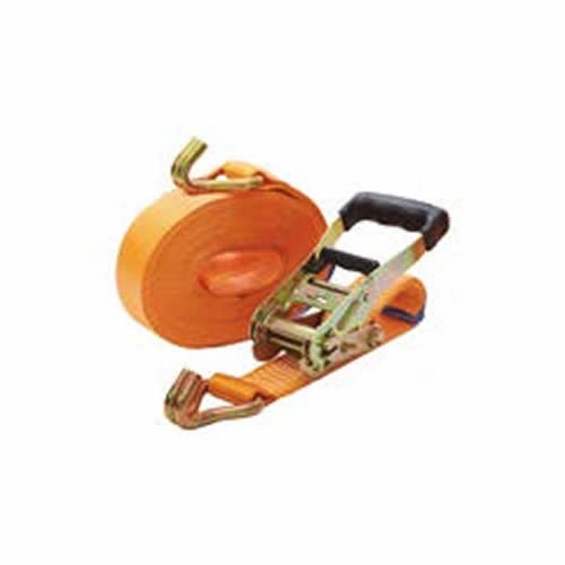 Cinta de amarre PRO para carga de trabajo de 5.000 Kg. - Parte corta: longitud 0,5 m. - Parte larga: longitudes disponibles de 8, 9, 10 y 12 metros. - Tipo de gancho: cerrado. - Presentación: rectractilado.