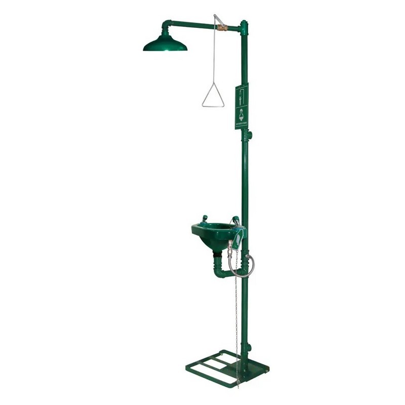 Ducha combinada con lavaojos. Ducha de accionamiento manual con el tirador. Lavaojos de accionamiento con pedal y maneta. Atomizadores cromados con protección contra el polvo. Conexiones de entrada y salida: 1-1/4. EN 15154-1 & 2; DIN 12899; ANSI Z 358.1 - Ducha de accionamiento con válvula de accionamiento manual mediante tirador rígido triangular y lavaojos de apertura lateral o también con pedal, accionable mediante simple presión. - El lavaojos proporciona agua aireada en segundos. - Difusor y poza de ABS y tubería de acero galvanizado. Válvula lavaojos y atomizadores cromados. - Tirador de acero inoxidable.