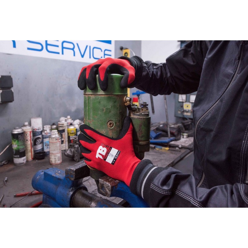 Guante soporte nailon rojo sin costuras. Recubrimiento nitrilo Sandy grip negro en palma. Puño elástico. Galga 15.
