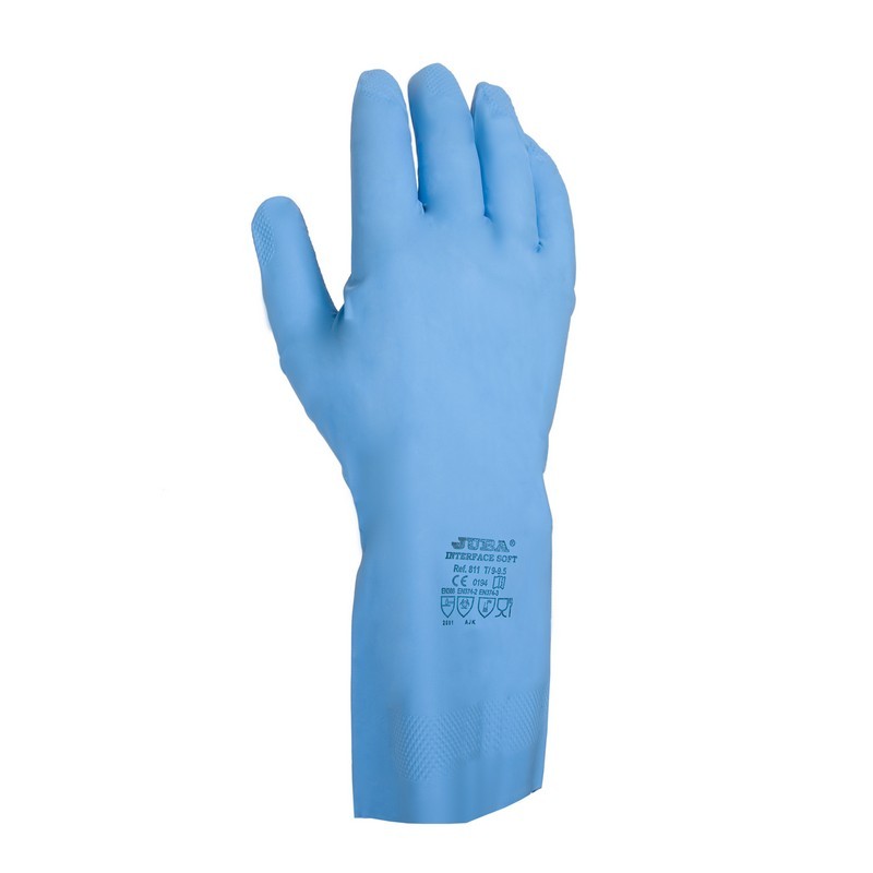 Guante de nitrilo satinado JUBA, sin soporte, muy ligero, clorinado, resistente y antideslizante, ofrece una gran comodidad durante la realización del trabajo. Es apto para tareas alimentarias, de limpieza, de imprenta o de industria. Datos técnicos: - Color: Azul. - Talla: 6-6.5 / 8-8.5 / 9-9.5. - Protección: AJK.