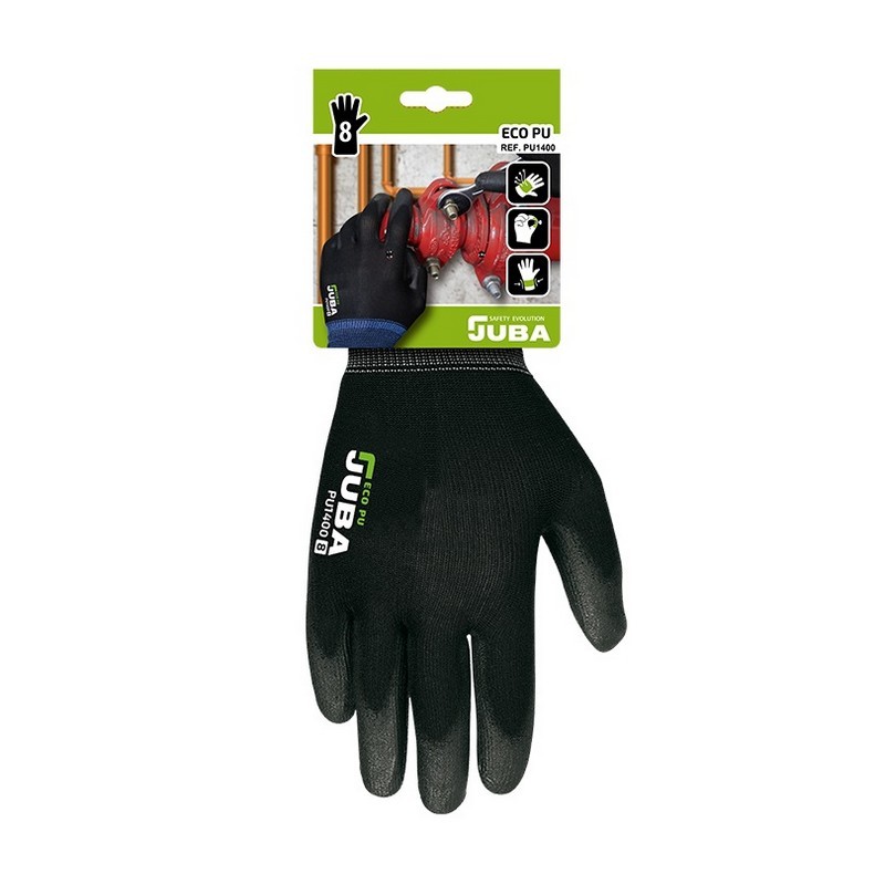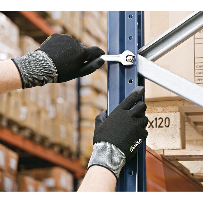 Guante de nylon JUBA, sin costuras, muy flexible y resistente, ofrece una gran comodidad, firmeza y precisión durante la realización del trabajo. Además, cuenta con un recubrimiento de poliuretano, lo que mejora el agarre en entornos secos, húmedos y aceitosos.