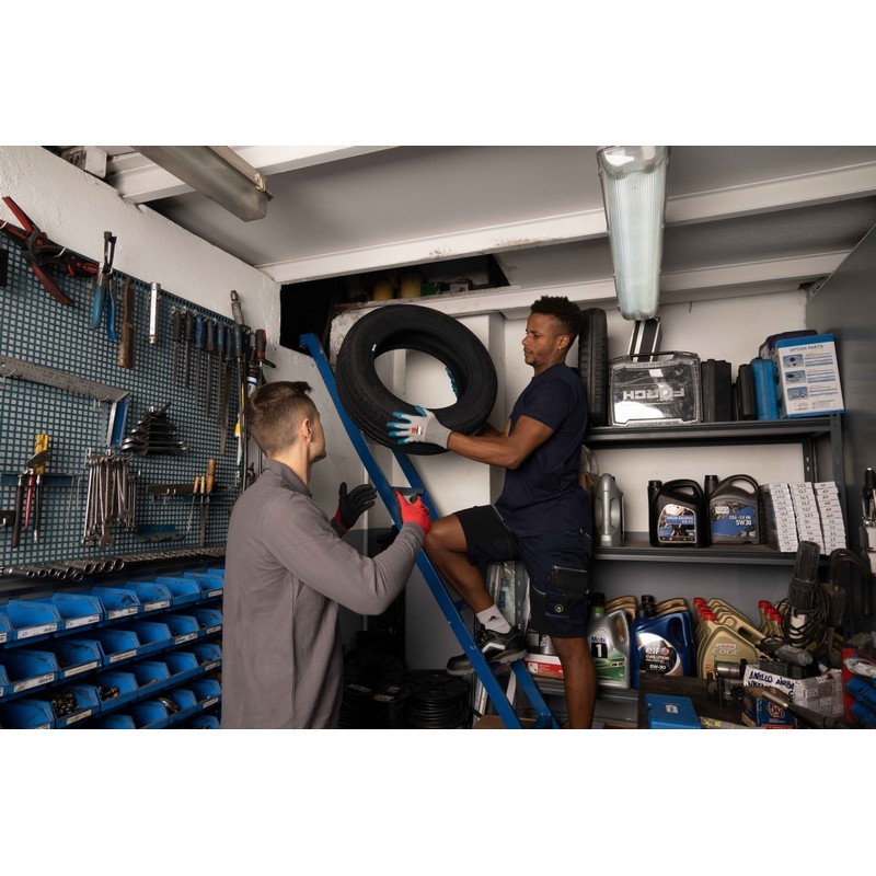 Molde ergonómico para minimizar la fatiga muscular de la mano. Su soportede algodón poliéster más elastómero, mejora el confort y adaptación a la mano del EPI. El algodón reduce la transpiración de la mano. - Recubrimiento de látex con acabado Crisss cross : el acabado actúa como ventosas en la manipulación de piezas engrasadas o mojadas, facilitando su manipulación y reduciendo el esfuerzo de la mano. A diferencia de otros acabados, en este guante no se utilizan elementos químicos para realizar la rugosidad en la palma, esto garantiza una mayor durabilidad. - Puño elástico: mejora la adaptación a la mano evitando que se mueva.