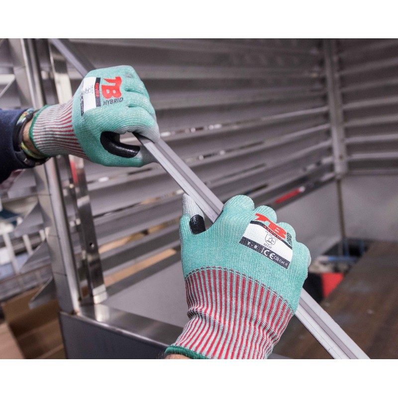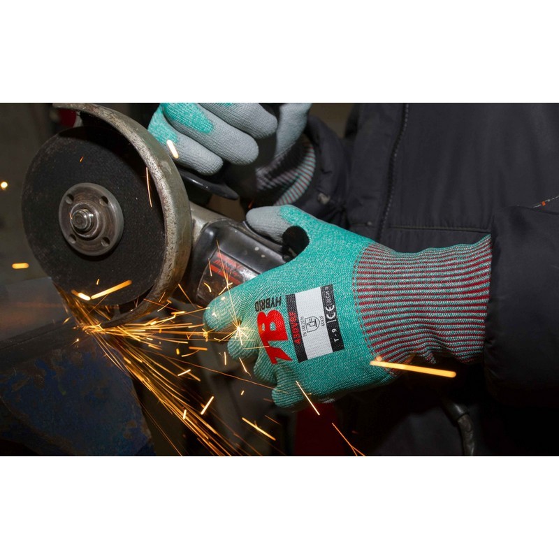 Guante soporte HPPE verde, fibra de acero y fibra de vidrio sin costuras. Recubrimiento de poliuretano gris en palma. Refuerzo nitrilo negro entre pulgar e índice. Puño elástico. Galga 13. EFICAZ EN PANTALLAS TÁCTILES