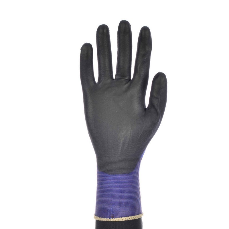 Guante soporte nailon azul sin costuras. Recubrimiento poliuretano negro en palma. Puño elástico. Galga 18. MARCADO HEAT TRANSFER.