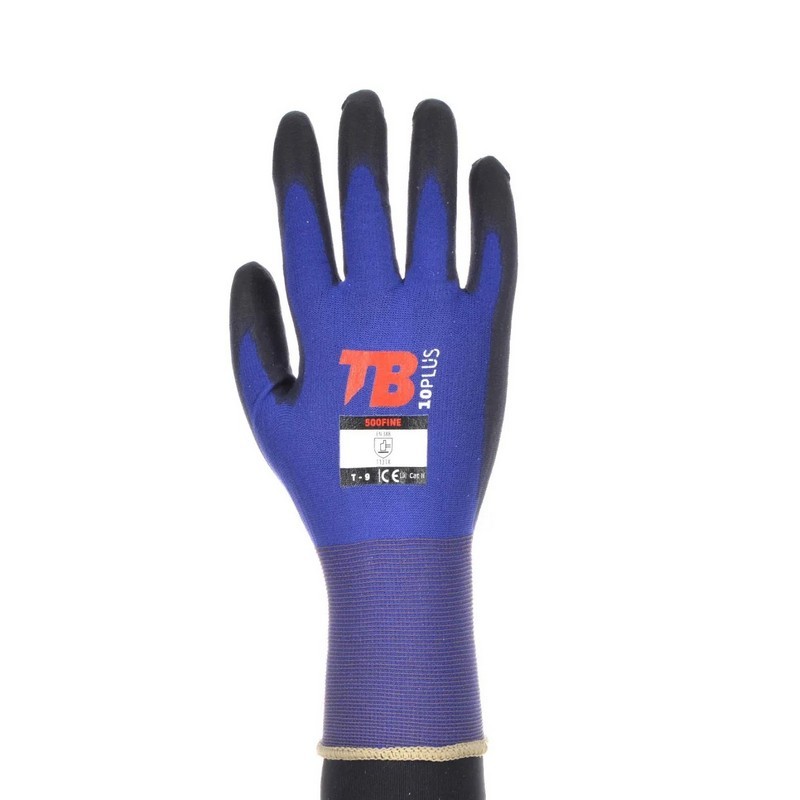 Guante soporte nailon azul sin costuras. Recubrimiento poliuretano negro en palma. Puño elástico. Galga 18. MARCADO HEAT TRANSFER.