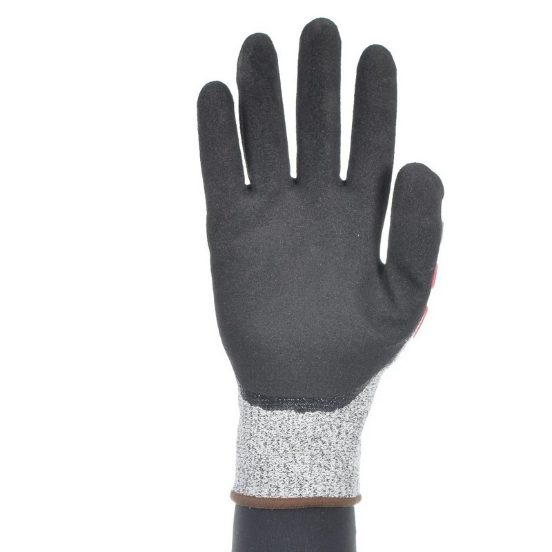 Guante soporte HPPE gris sin costuras. Recubrimiento nitrilo Sandy grip negro en palma. Protecciones latex anti-impacto rojo en dorso. Puño elástico. Galga 13.