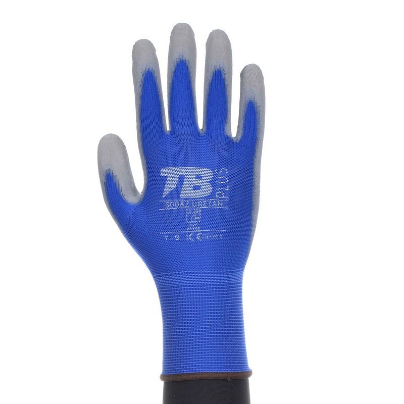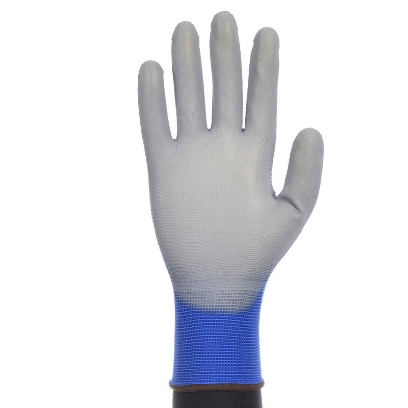 Guante soporte nailon azul sin costuras. Recubrimiento poliuretano gris en palma. Puño elástico. Galga 13.