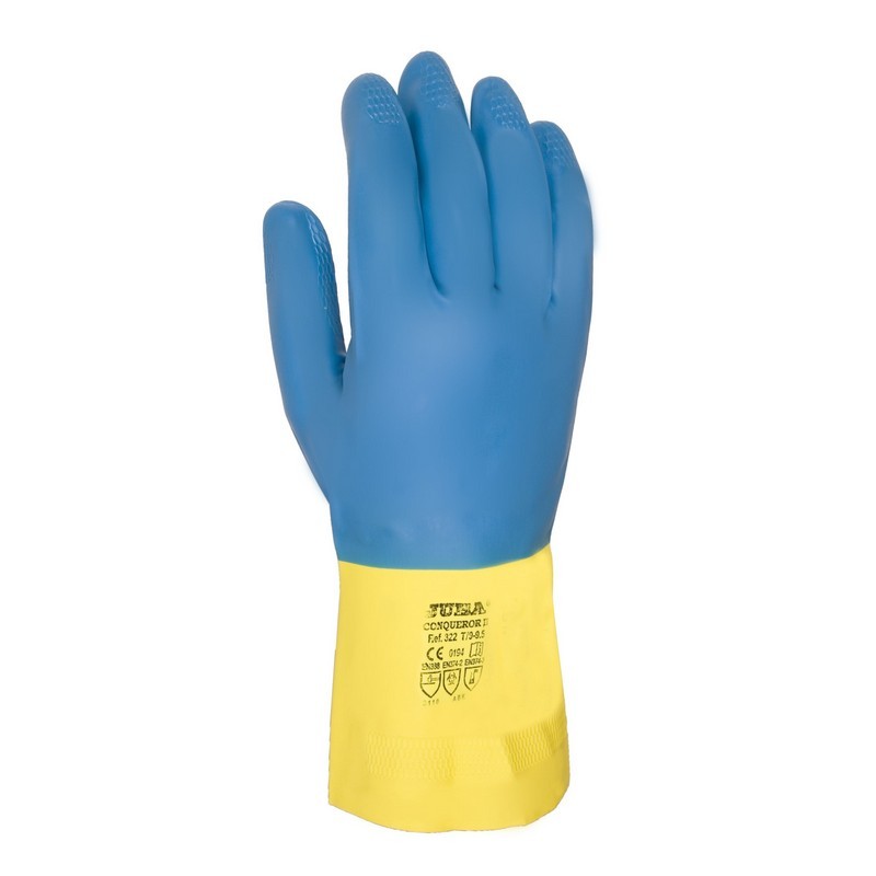Guante de neopreno y látex JUBA, sin soporte, ergonómico, clorinado y resistente, ofrece una gran comodidad y seguridad durante el trabajo, gracias al reforzamiento de la palma y a su acabado en panel de abeja. Es muy útil para tareas de laboratorio, industria química, limpieza, automoción?€? Datos técnicos: - Color: Azul-Amarillo. - Talla: 8-8.5 / 9-9.5 / 10-10.5. - Protección: AKL.