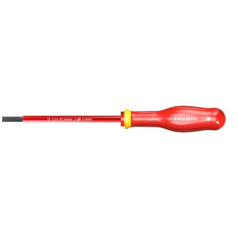 Set con 6 destornilladores FACOM de tipo aislado, que incluye 4 destornilladores planos con hoja redonda y 2 destornilladores pozidriv con hoja redonda.