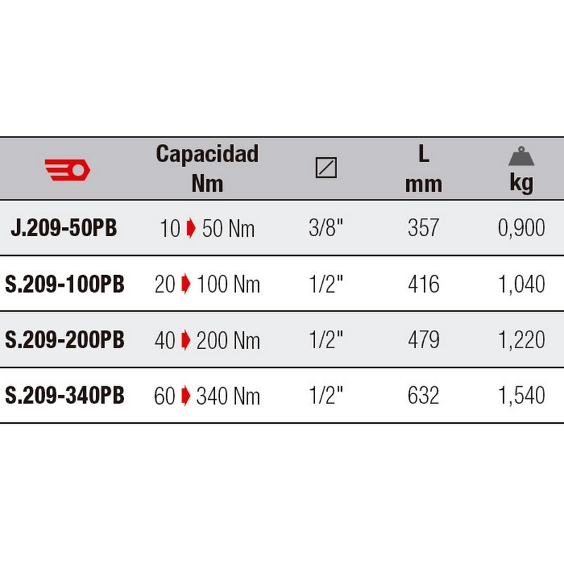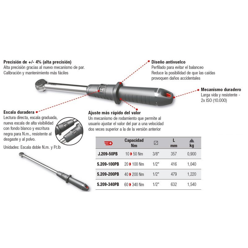 Precisión de +/- 4% (alta precisión): Alta precisión gracias al nuevo mecanismo de par. Calibración y mantenimiento más fáciles. Diseño antivuelco: Perfilado para evitar el balanceo. Reduce la posibilidad de que las caídas provoquen daños accidentales. Escala duradera: Lectura directa, escala graduada, nueva escala de alta visibilidadcon fondo blanco y escritura negra para N.m., resistente al desgaste y al polvo. Unidades: Escala doble N.m. y Ft.lb Ajuste más rápido del valor: Un mecanismo de rodamiento que permite al usuario ajustar el valor del par a una velocidad dos veces superior a la de la versión anterior Mecanismo duradero: Larga vida y resistente - 2x ISO (10.000)