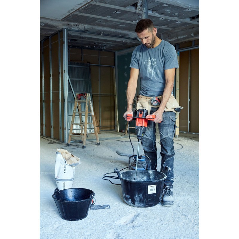 Máquina mezcladora profesional de 1800 W con 2 velocidades (0-440 rpm y 0-780 rpm) para un uso intensivo y con alta capacidad de mezclado. Permite adaptar la potencia útil en función del material, la densidad y la cantidad de mezcla. Además posibilita un arranque progresivo que evita que el material salpique fuera de forma incontrolada. Gran comodidad gracias a un volante amplio y elevado con empuñaduras bimateiales para una mejor ergonomía y control. Asa metálica resistente y enchufe Tipo F (Euro) reforzado para una mayor robustez. Cable de 3 metros de longitud para llegar a a cualquier enchufe y fácil acceso a las escobillas para facilitar la sustitución. Segura, con botón de desbloqueo. Incluye una varilla K4 M14 de 140 mm de diámetro y 590 mm de longitud. Para realizar mezclas homogéneas de morteros, cementos, resinas, pinturas y colas. Robusta. Motor potente de 1.800 W, preparado para un uso intensivo con gran capacidad de mezclado. Asa metálica resistente con refuerzos laterales y enchufe reforzado. Segura. Arranque progresivo con 2 velocidades y botón de desbloqueo. Cómoda. Volante amplio y elevado con empuñaduras bimateriales para una mejor ergonomía. Incluye varilla K4 de 140 mm de diámetro, especial para morteros, cemento-cola y masillas. Máquina mezcladora profesional de 1800 W con 2 velocidades. Incluye una varilla de 140 mm.