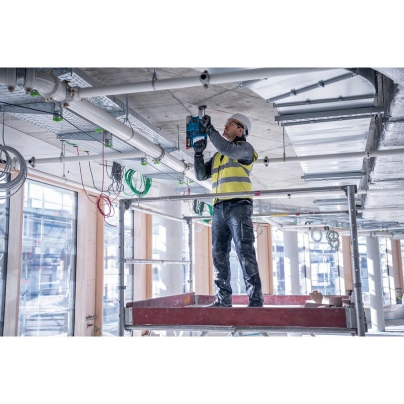 El rotomartillo GBH 18V-22 Professional es la opción ideal si buscas una herramienta eléctrica potente y manejable. Es perfecta para perforar orificios de entre 6 mm y 10 mm, tanto si te dedicas a la fontanería y tienes que instalar obras sanitarias como si eres carpintero y estás preparando la instalación de una cocina. También te ayudará si eres electricista, sobre todo cuando tengas que perforar en altura para instalar luces, lámparas o detectores de humo. La aspiradora GDE 18V-12 Professional está especialmente diseñada para facilitar el trabajo en altura. Compatible con todas las baterías del Bosch Professional 18V System y con las de la alianza de baterías multimarca AMPShare.