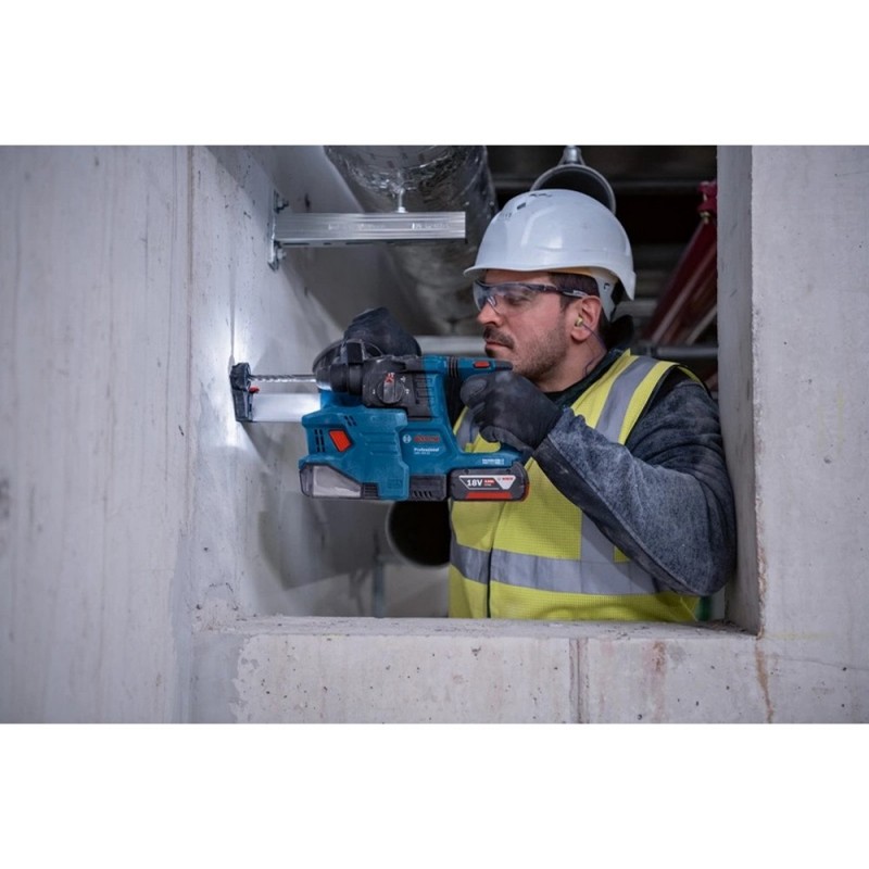 El rotomartillo GBH 18V-22 Professional es la opción ideal si buscas una herramienta eléctrica potente y manejable. Es perfecta para perforar orificios de entre 6 mm y 10 mm, tanto si te dedicas a la fontanería y tienes que instalar obras sanitarias como si eres carpintero y estás preparando la instalación de una cocina. También te ayudará si eres electricista, sobre todo cuando tengas que perforar en altura para instalar luces, lámparas o detectores de humo. La aspiradora GDE 18V-12 Professional está especialmente diseñada para facilitar el trabajo en altura. Compatible con todas las baterías del Bosch Professional 18V System y con las de la alianza de baterías multimarca AMPShare.
