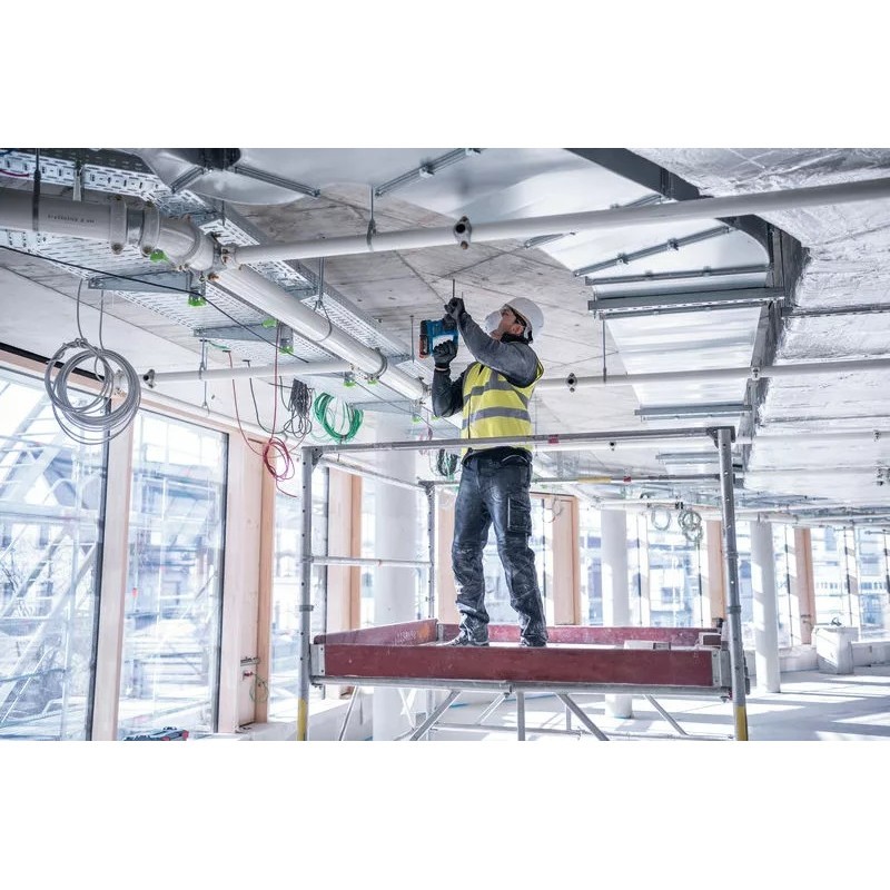 El rotomartillo GBH 18V-22 Professional es la opción ideal si buscas una herramienta eléctrica potente y manejable. Es perfecta para perforar orificios de entre 6 mm y 10 mm, tanto si te dedicas a la fontanería y tienes que instalar obras sanitarias como si eres carpintero y estás preparando la instalación de una cocina. También te ayudará si eres electricista, sobre todo cuando tengas que perforar en altura para instalar luces, lámparas o detectores de humo. La aspiradora GDE 18V-12 Professional está especialmente diseñada para facilitar el trabajo en altura. Compatible con todas las baterías del Bosch Professional 18V System y con las de la alianza de baterías multimarca AMPShare.