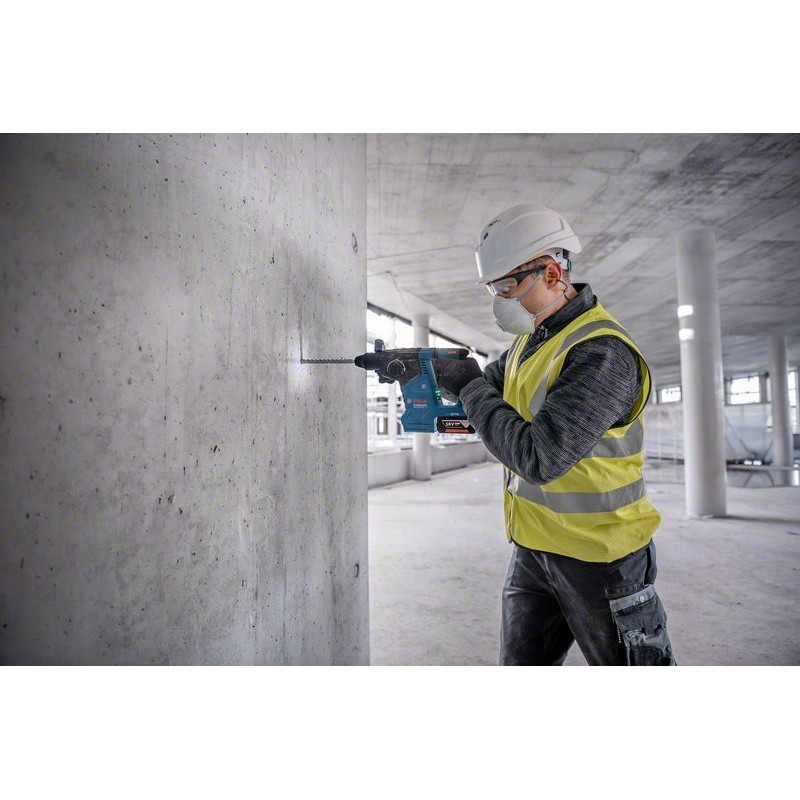 Martillo perforador SDS plus a batería GBH 18V-24 C, El GBH 18V-24 C Professional es un martillo perforador multiusos a batería SDS plus de Bosch, perfecto para el día a día. Está equipado con un motor Brushless sin escobillas e incluye KickBack Control y Vibration Control para aumentar la protección de la salud del usuario. Su pantalla HMI presenta el estado de la batería de forma práctica y otras notificaciones importantes para el usuario. Su módulo Bluetooth Connectivity integrado permite conectar rápida y fácilmente la aplicación Toolbox de Bosch para realizar con rapidez los ajustes personales. Es compatible con el sistema de aspiración autónomo GDE 18V-16 Professional de Bosch que se integra en el martillo con un clic. El GBH 18V-24 C Professional está concebido para perforar y cincelar en hormigón y mampostería. Es compatible con todas las baterías y cargadores del Professional 18V System de Bosch. También compatible con AMPShare, la alianza de baterías multimarca. También incluye velocidad constante, Electronic Motor Protection (EMP), iluminación LED, embrague de control de rotación, velocidad variable y Vario-Lock.