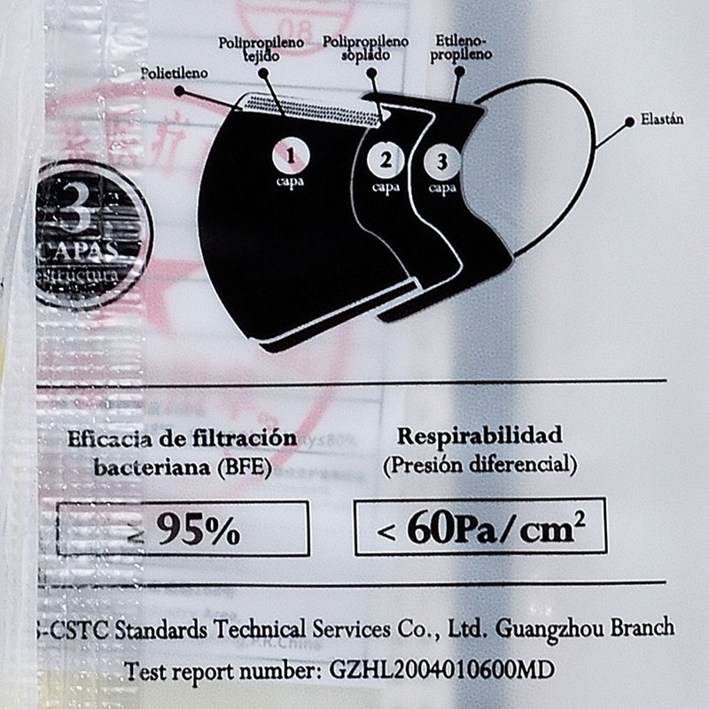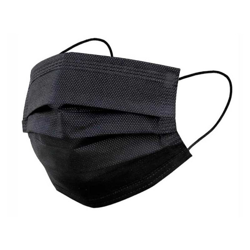 Mascarilla no reutilizable en color negro, compuesta por una capa interna y externa fabricadas con tela no tejida, la capa central está hecha de tela fundida no tejida. Dispone de un clip de fijación nasal y goma elástica para orejas. Cumple con la norma CE EN0064-1:2020. Se presenta en una bolsa que contiene 10 unidades.