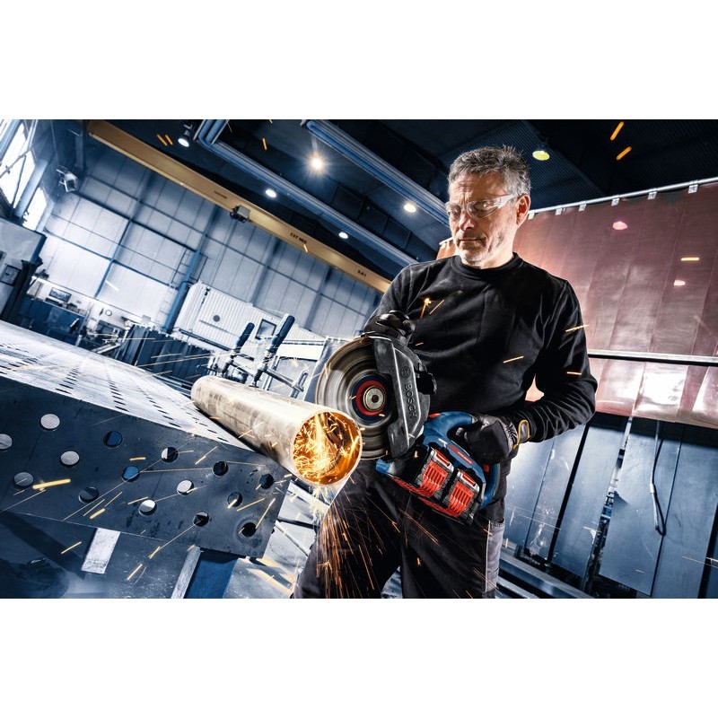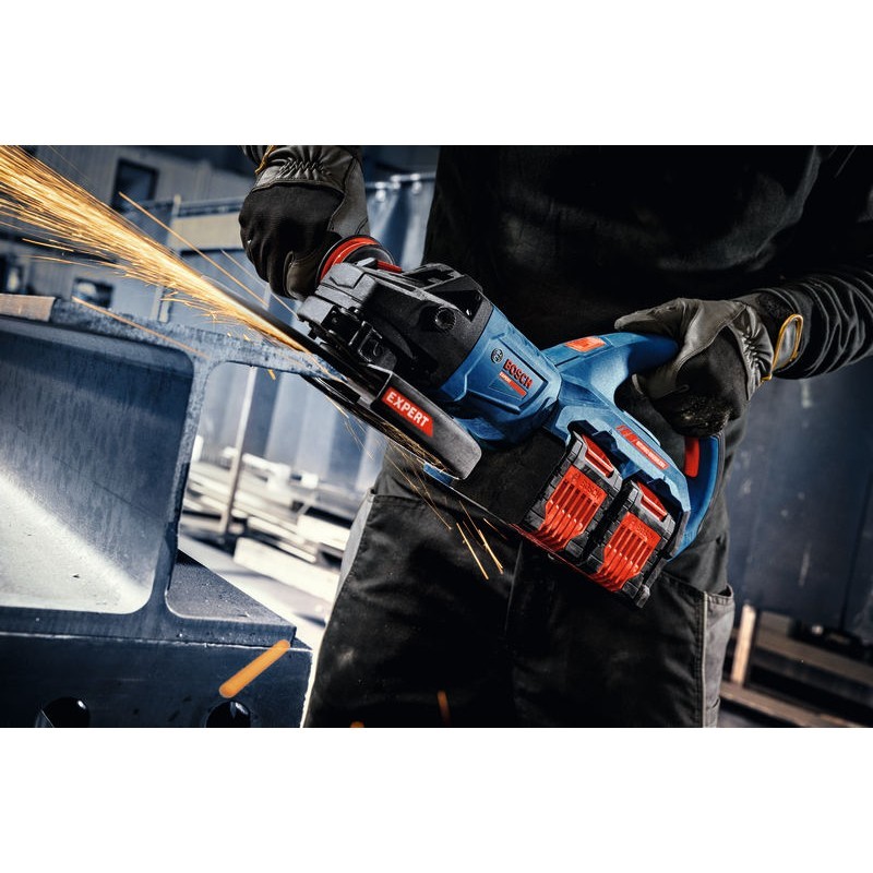 La amoladora angular EXPERT EXWS18V2-230P con motor Brushless sin escobillas y 2 baterías de 18V proporciona hasta unos 2700 W de potencia equivalente con cable para trabajar de forma rápida y eficiente. Su tecnología BITURBO Brushless sin escobillas, con sistema de 2x 18V y transmisión mecánica de alto rendimiento, está diseñada para aprovechar toda la alta potencia de las baterías EXPERT. La carcasa giratoria del motor permite adecuar su posición a todas las aplicaciones de corte y rectificado. Además, el diseño perfectamente equilibrado, con centro de gravedad óptimo, permite un control excepcional en cualquier situación. La EXPERT EXWS18V2-230P ofrece una protección óptima del usuario: La función KickBack Control minimiza el riesgo de lesiones al detener el motor en caso de atasco del disco. El interruptor de hombre muerto PROtection apaga la herramienta al instante si se suelta, y la función de frenado inteligente detiene la máquina significativamente más rápido que sin este sistema. Compatible con el sistema Bosch Professional 18V System y con la alianza de baterías multimarca AMPShare.