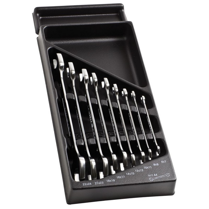 Módulo FACOM que incluye 9 llaves fijas, con las siguientes medidas: 6x7 / 8x9 / 10x11 / 12x13 / 14x15 / 16x17 / 18x19 / 21x23 / 22x24 mm.