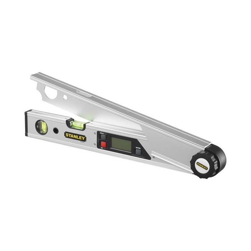 Estructura de 40cm y de aluminio anodizado, puede ser utilizado como nivel gracias a sus 2 viales. Pantalla LCD y funciones HOLD, cálculo de ángulo suplementario, sencillo y compuesto. Funciona con 2 pilas AAA incluidas (±100horas de duración). Ángulo de medición 0° a 180° y precisión ±0,1°.