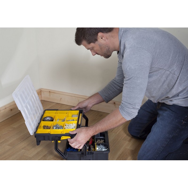 2 niveles: organizador y caja de herramientas pequeña. Concebido para almacenar herramienta manual y eléctrica en el nivel inferior y piezas pequeñas en el nivel superior