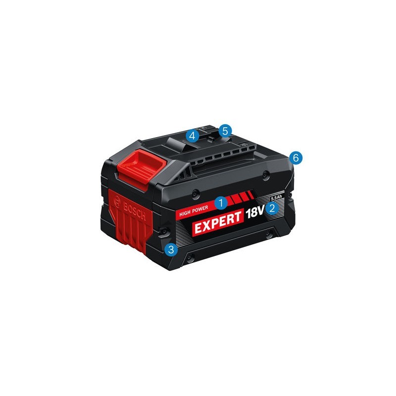 La batería Expert de alta potencia EXBA18V-55 proporciona hasta 2000 W de potencia máxima para aplicaciones exigentes, además de una mayor autonomía (basado en pruebas internas de laboratorio, con potencia máxima instantánea, batería nueva y con carga completa). Sus celdas de alta potencia están diseñadas para ofrecer un rendimiento extraordinario, con una potencia excelente y una densidad energética excepcional. Con su robusta carcasa reforzada y la excelente gestión térmica COOLPACK 2.0, la batería EXBA18V-55 cuenta con una larga vida útil para ser la solución ideal de los profesionales que necesitan durabilidad y rendimiento. El GAL 12V/18V-80 Professional es un cargador rápido con doble rango de tensión para todas las baterías Bosch Professional de 12V y 18V. Gracias a una corriente de carga de 8 A, puedes cargar por completo una batería EXBA18V-55 en 47 minutos. Este cargador reduce el tiempo de inactividad con el Active Air Cooling 3.0 inteligente al enfriar la batería antes, durante y después de la carga. Este es un cargador compacto práctico de usar con una solución de compartimento en compartimento. La batería EXBA18V-55 cuenta con un indicador de 5 luces LED que muestra el estado de carga y la capacidad restante, además de detectar el riesgo de que se produzcan defectos. Los cargadores EXBA18V-55 y GAL 12V/18V-80 son compatibles con el sistema Bosch Professional 18V System y con la alianza de baterías multimarca AMPShare. Además, el cargador GAL 12V/18V-80 también es compatible con el sistema Bosch Professional 12V. La batería EXBA18V-55 pesa 1,02 kg y el cargador GAL 12V/18V-80 Professional ofrece un montaje fácil en la pared