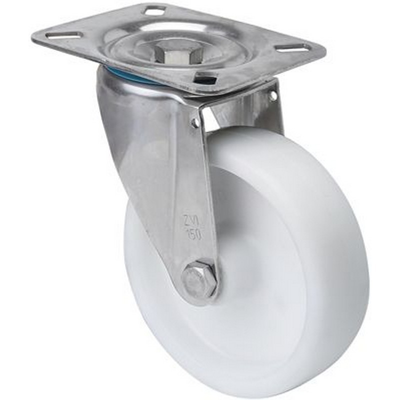 Ruedas de poliamix blanco con todos sus componentes de acero inoxidable (AISI 304). Especialmente indicada para soportar cargas hasta 400 Kg.
