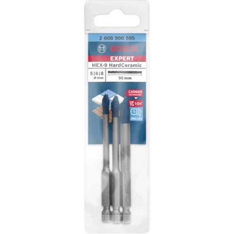 Larga duración al perforar baldosas duras! Comienza con precisión la perforación de orificios gracias a la punta centradora de diseño especial. Dado que los azulejos de revestimiento se han vuelto más grandes y duros, perforar agujeros en ellos se ha convertido en una tarea difícil con una broca para baldosas. Por ello, Bosch ha desarrollado la broca EXPERT HardCeramic, que es capaz de perforar en seco cerámica dura y dura mucho más que otra broca de referencia para baldosas. La broca Bosch EXPERT HEX-9 HardCeramic está diseñada para taladrar cerámica y puede taladrar agujeros en baldosas duras sin lubricante ni refrigeración. Punta de broca extremadamente duradera con la tecnología Bosch Carbide Technology.
