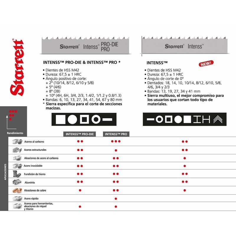 Sierra multiuso, el mejor compromiso para los usuarios que cortan todo tipo de materiales. - Dientes de HSS M42. - Dureza 67,5 HRC - Ángulo de corte de 0° - Dentados: 18, 14, 10, 10/14, 8/12, 6/10, 5/8, 4/6, 3/4 y 2/3. - Bandas: 13, 19, 27, 34 y 41 mm.