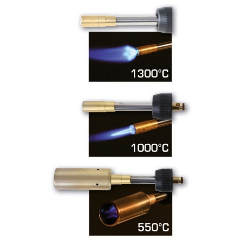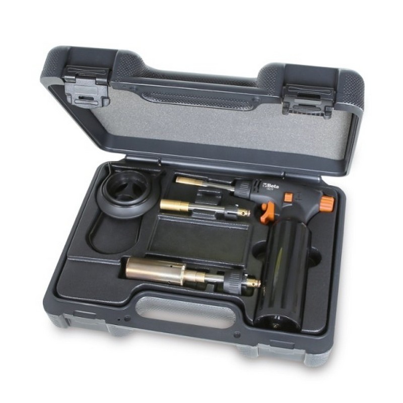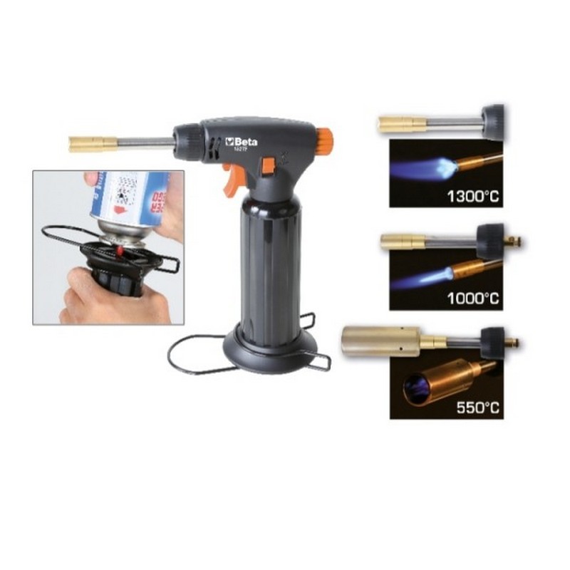 Soldador de gas butano recargable para deformar plásticos y desbloquear partes metálicas. - Depósito de 35g - 3 boquillas intercambiables de 550 °C; 1000 °C y 1300 °C - Se suministra con caballete en maletín rígido