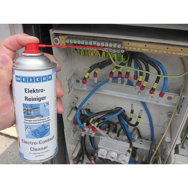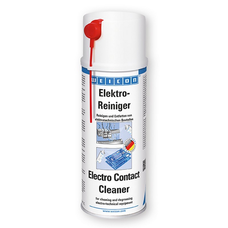 El Limpiador de Contactos Electrónicos es un limpiador especial usado para limpiar y desengrasar rápida y eficientemente todo tipo de contactos sucios o corroídos.El Limpiador de Contactos Electrónicos se desarrolló especialmente para la limpieza de componentes electrónicos y mecánicos. La fórmula especial contiene diluyentes de gran pureza permitiendo eliminar capas de óxido y sulfuro, residuos de erosión eléctrica así como incrustaciones de polvo mezclado con resinas u hollín. Reduce la caída de tensión y aumenta la conductividad eléctrica. Elimina la suciedad que puede causar corrientes de fuga.El Limpiador de Contactos Electrónicos WEICON puede aplicarse en componentes electrotécnicos o mecánicos tales como máquinas eléctricas, equipos de medición, herramientas, básculas, interruptores y sensores o en conexiones eléctricas enchufadas, contactos, relés e instalaciones de distribución.DATOS TÉCNICOS:- Olor: Diluyente- Características: Mezcla de disolventes de alta pureza- Estabilidad de almacenaje: 24 meses- Color: Transparente- Código ISSA: 53.402.22- Código IMPA: 450808