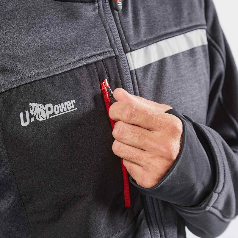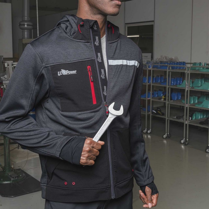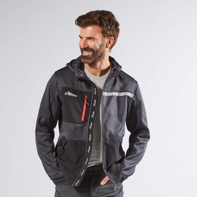 Galaxy es una sudadera de trabajo con cremallera que garantiza una total libertad de movimiento. Sudadera suave y transpirable, muy cómoda y resistente, de secado rápido. Sudadera con dos bolsillos con orificios de drenaje y un bolsillo vertical en el pecho con cierre de cremallera. Sudadera con capucha fija regulable con parte interna forrada con suave jersey 100 % poliéster y orificios transpirables en las axilas. La banda reflectante en el pecho izquierdo y en la capucha garantiza visibilidad en las variantes de color Asphalt Grey y Dark Green, mientras en la variante Black Carbon las bandas tienen un efecto carbono. Impresión del logotipo reflectante ?€?U-Power?€? del lado derecho del pecho. El puño contravientos elástico con orificio para el pulgar también cuenta con un práctico e innovador orificio para el reloj. Sudadera ideal para usar sola o debajo de una chaqueta de trabajo. Ideal para: almaceneros, camioneros, logística, construcción y albañilería, electricistas, fontaneros, carpinteros y artesanos en general, jardineros y sector agrícola. COMPOSICIÓN: - TEJIDO PRINCIPAL: 100% poliéster (290 gr/m²) - TEJIDO EN CONTRASTE: 90% nailon, 10 % spandex (260 gr/m²) MEDIDAS/TAMAÑOS DISPONIBLES: S-5XL REGLAMENTOS EUROPEOS: -
