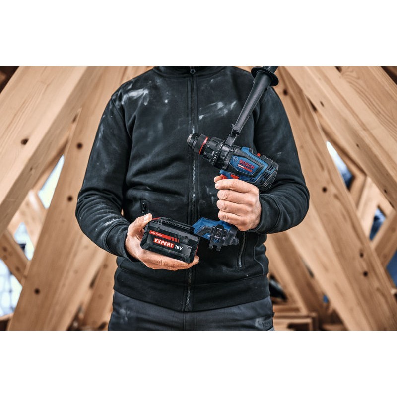 El EXPERT EXSB18V-150 es un taladro percutor de gama alta, con rendimiento y control sin igual, para una amplia gama de trabajos de atornillado y perforación con percusión hasta 30 000 ipm. Es la elección perfecta para trabajar muy rápido gracias a su motor Brushless sin escobillas con tecnología BITURBO, las baterías EXPERT de alta potencia y un par de apriete de hasta 150 Nm. La función KickBack Control minimiza el riesgo de lesiones en caso de atasco del taladro. Esta función se puede activar y desactivar según se quiera. La detección electrónica de ángulo de gran precisión asegura la inserción de tornillos largos a un ángulo correcto. Gracias a su portabrocas metálico de 13 mm y caja de cambios metálica, el taladro es extremadamente fiable y robusto para todo tipo de trabajo. Incluye una empuñadura auxiliar, ajustable fácilmente a cualquier posición. La rápida elección del modo de trabajo permite cambiar fácilmente entre taladrar con o sin percusión y atornillar. El EXPERT EXSB18V-150 ofrece resultados óptimos de perforación y atornillado en madera, mampostería o metal, sobre todo en diámetros grandes de hasta 150 mm. Compatible con el Bosch Professional 18V System y con la alianza de baterías multimarca AMPShare.
