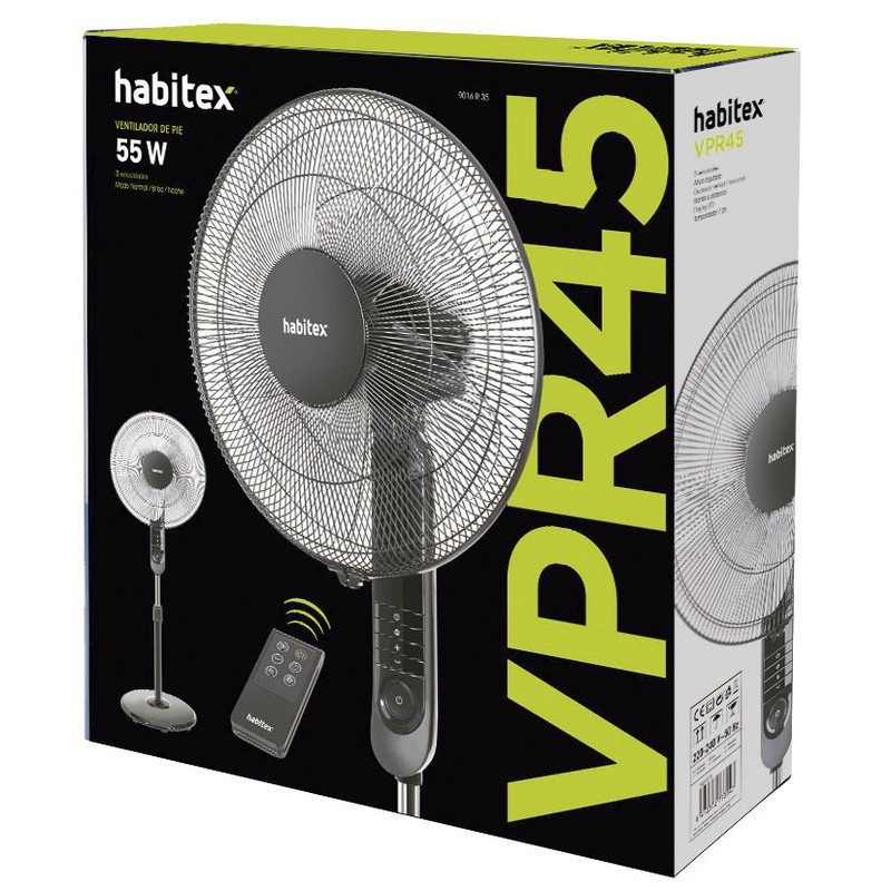 El ventilador de pie HABITEX VPR45 es perfecto para esos veranos calurosos. Podrás hacer el día más llevadero gracias a la elección de uno de los 4 modos de funcionamiento: silencioso, normal, noche y brisa, adecuándolo al momento del día. Selecciona modo normal cuando el calor apriete, modo brisa cuando deje de ser tan intenso y, modo noche que aportará un aire moderado pero suficiente para mantener una temperatura óptima en esas noches donde necesitas una ventilación ligera para conciliar el sueño. También incorpora un temporizador de 7,5 horas para poder programar un apagado automático. Su oxcilación es horizontal, y además, incorpora un mando a distancia para aumentar la comodidad de operación; funciona con 2 pilas AAA R3 que no están incluidas. Viene presentado en caja. Tiene 3 años de garantía.